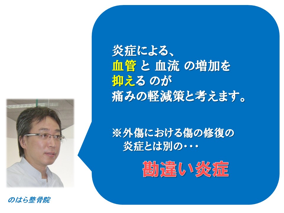 勘違い炎症による、毛細血管と血流の増加を抑えるのが、痛みの軽減策だと考えます。