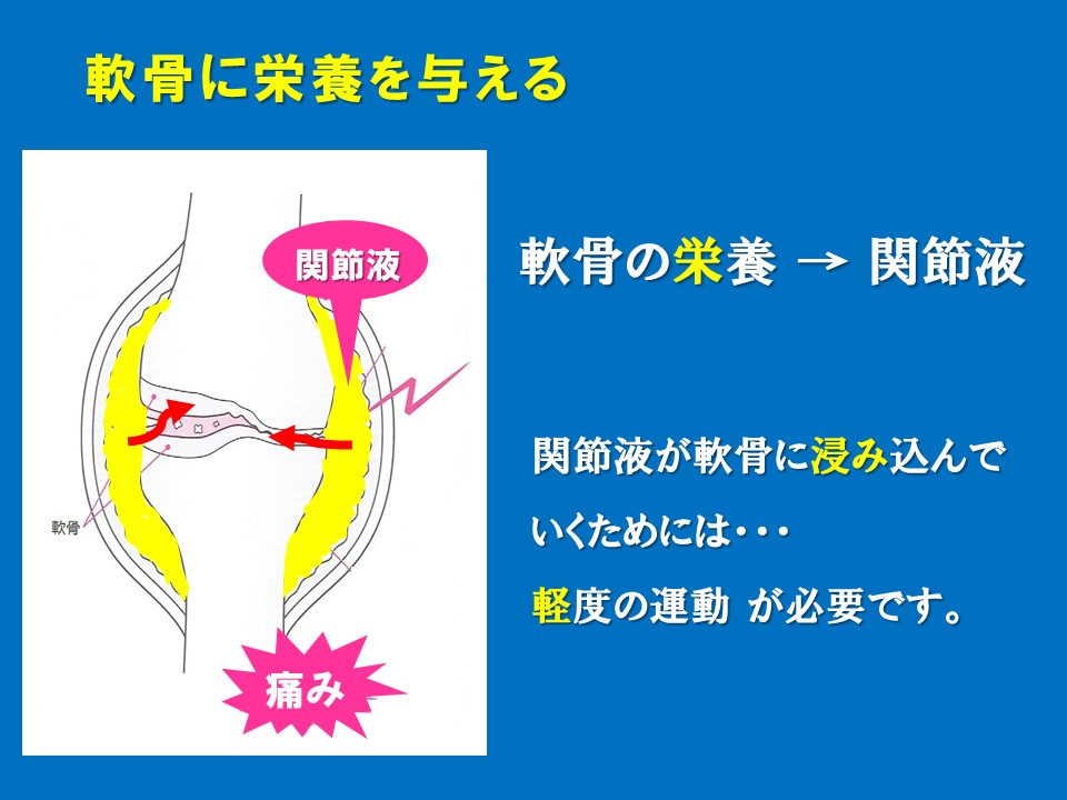 軟骨の成分の約70%は水分(関節液)で、体重が乗ると染み出して保護する働きになっています。